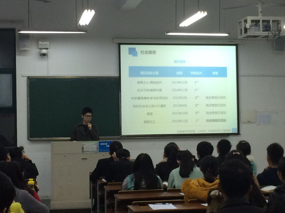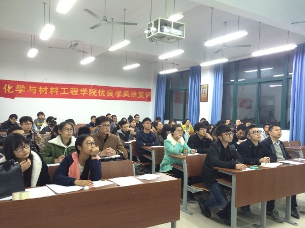 在11A310室举行了2015-2016学年第一学期“院优良学风班”现场评比活动。学院党总支副书记潘从义出席活动并担任评委,化材学院团总支副书记谢张仁、学生会主席牟露茜、副主席朱铮等担任大众评委。