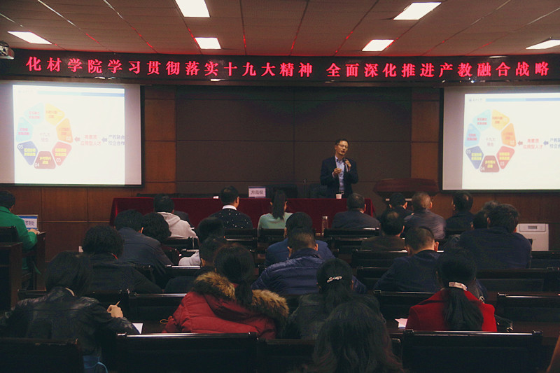 2017年12月6日下午1:30,我院邀校党委委员、副校长方益权在化材楼11B-208室作题为《学习贯彻十九大精神 全面深化推进产教融合战略》的专题报告,本次报告会由院长王舜主持,化材学院全体教职工参加了本次学习会。