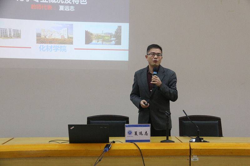 宣讲会伊始,夏远志博士作为化本专业教师代表向听众介绍了化材学院化本专业的发展,从专业概况、定位与目标、师资队伍、教学资源建设与成效、特色与优势等几个方面展示了化本专业的过去、现在及将来。来自13化本班的王优媛通过介绍自己的班级向在场学生展示了化本专业之美以及专业就业广阔的前景。接着,化工系主任徐进以他自己的经历和对化工专业的认识用幽默的口吻对在场学生讲解了化工专业在学习和就业方面的一些事宜,使听众对化工专业有了更深入的了解。来自13材料班的牟露茜也作为班级代表向听众展示了材料专业的魅力。最后,毕业于应用化学专业的校友苏海林以华峰集团经理的身份向在场学生仔细讲解了应化专业在职场上的宽广出路,同时他也也向在场新生提出了一些建议。