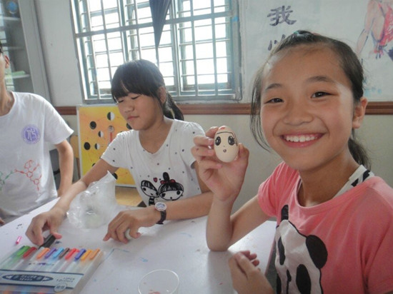 今天,领导的慰问让队员们觉得一切辛苦都是值得的,队员们对支教实践活动的热情在今天再次被点燃。而蛋壳艺术活动让队员们发现,和这群天真可爱的孩子在一起,真的很幸福。