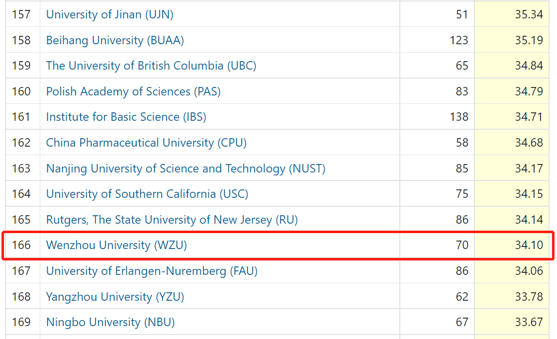 化学学科跃居全球第166位,居省内高校第3位(含浙大)和国内高校第70位(不含港澳台),创历史新高。