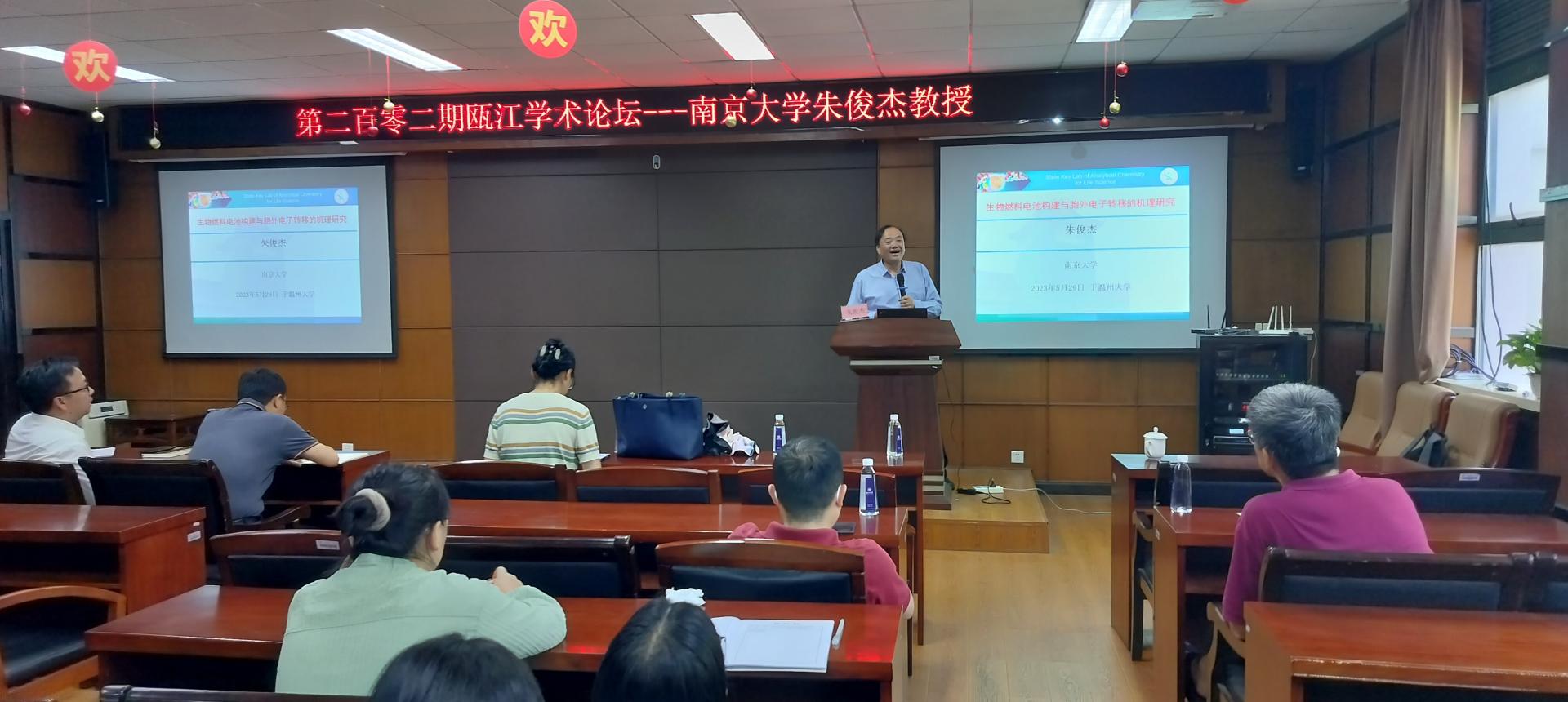 ,在11B-208作了题为“生物燃料电池的构建与胞外电子转移机制的研究”的讲座。报告由化材学院吕晶晶教授主持,杨植院长、金辉乐副院长、陈锡安副院长以及任林教授等10余位教师和20多位研究生到会参加。首先,吕晶晶教授对朱俊杰教授的到来表示热烈欢迎,并向师生介绍了朱俊杰教授的基本情况。