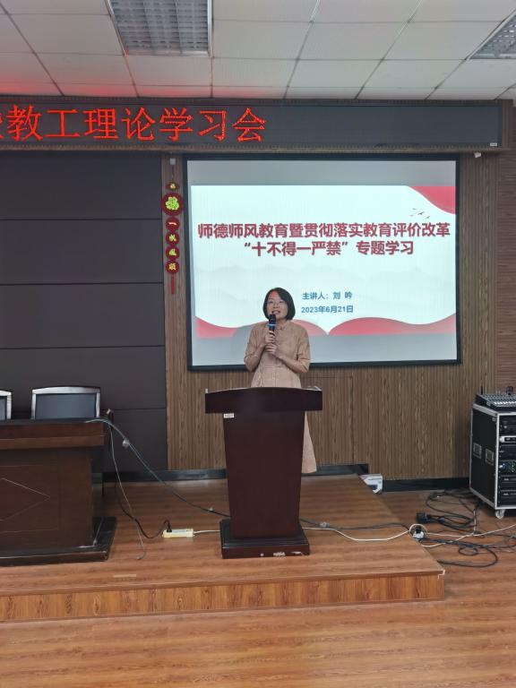刘吟书记领学师德师风教育暨贯彻落实教育评价“十不得一严禁”专题学习。她围绕《深化新时代教育评价改革总体方案》和“十不得一严禁”负面清单,结合学院工作实际,就“学校评价、教师评价、学生评价”等内容进行深入学习研讨,做到教师、管理人员全覆盖。