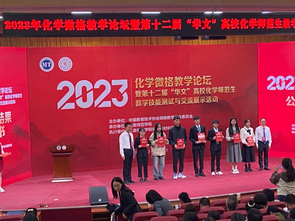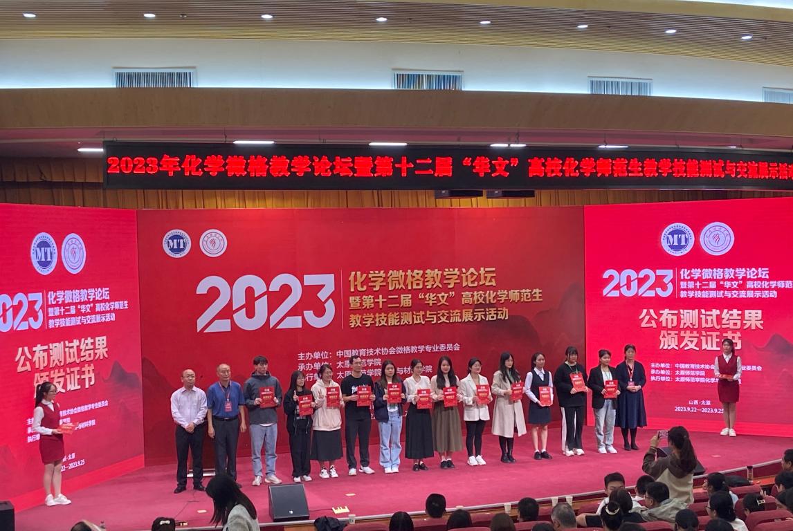 9月22日-25日,由中国教育技术协会微格教学专业委员会主办,山西太原师范学院承办的第十二届“华文”师范院校化学教育师范生教学能力测试与交流展示活动落下帷幕。我院高度重视本次比赛,积极备战全国比赛,我院六位参赛学生在陈迪妹、王秀杰、叶剑强、陈素琴等四位老师的精心指导与反复打磨下,最终获得了一等奖6项、二等奖6项的优异成绩。其中“教学技能展示测试”一等奖4项、二等奖2项;“教学设计能力测试”一等奖2项、二等奖4项。