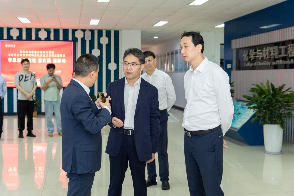 陈峰一行认真听取了学院在学科建设、师资队伍建设、人才培养、科学研究、服务地方等方面的情况。并先后参观了学院院史展示厅、样板党支部、扶摇书舍,深入了解化材学院的历史与现况。