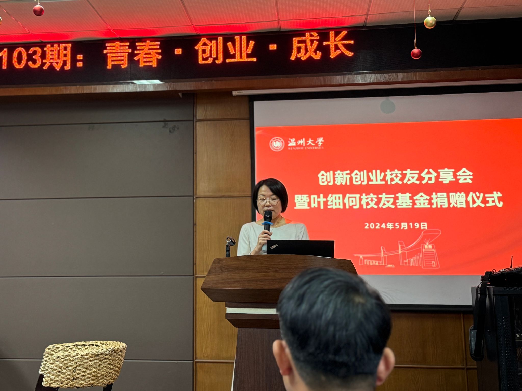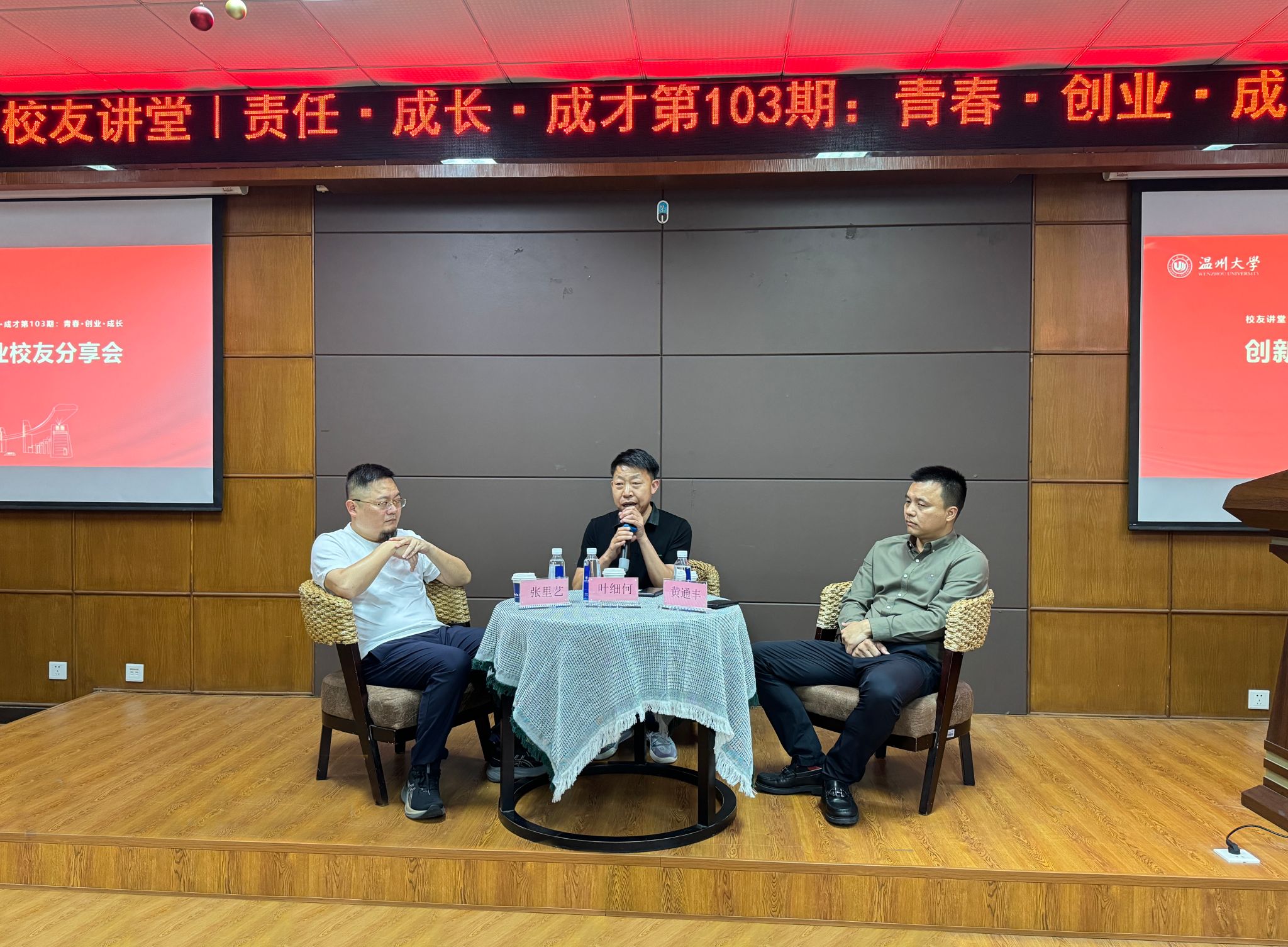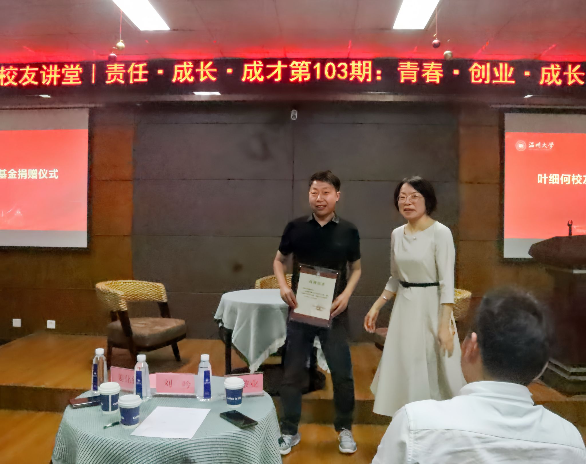办学91周年校庆日,化材学院创新创业校友分享会暨教育基金捐赠仪式在化材楼11B208会议室顺利举行。我院95级工业分析校友,浙江宏舜建设有限公司总经理叶细何、01级应化校友温州瑞通化工有限公司董事长黄通丰、02级材料校友浙江环诺环保科技股份有限公司董事长张里艺三位校友受邀出席本次活动。学院党委书记刘吟、党委副书记周敬业以及学院师生代表70余人参会。活动由学院校友理事会姜化钧会长主持。