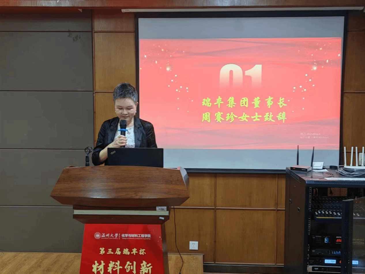 温州市瑞丰控股集团有限公司董事长周赛珍女士为本次比赛致开幕辞,周赛珍女士简要介绍了设立奖学金的初衷,以及它对学院和学生的意义,并对参赛的学生表示鼓励,希望借此机会充分发挥他们的创造力和潜力。