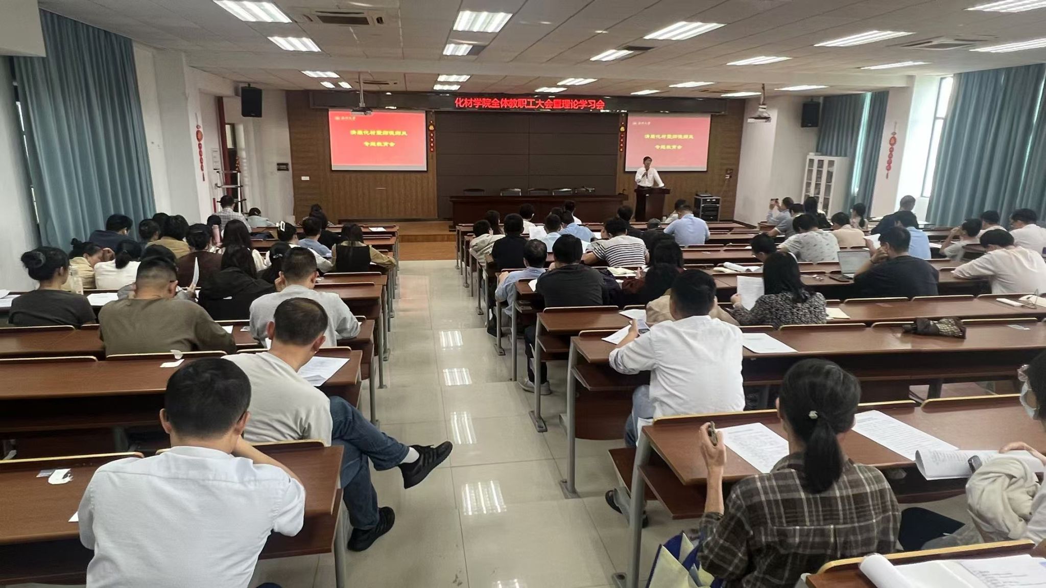在11C401会议室召开清廉化材暨师德师风专题教育会,全体教职工参加,会议由学院党委书记邹超主持。