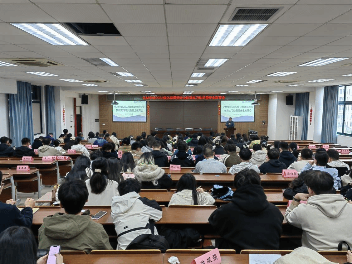 为深入贯彻落实新时代教师教育改革发展要求,扎实推进师范生教育实践工作规范化建设,全面提升师范生职业素养与育人能力,2025年3月3日,化材学院在11C-401教室召开2022级教育实习动员暨安全教育大会。副院长张礼杰、副书记王晓华、化学系主任方国勇以及陈迪妹、王嫁国、叶剑强等指导老师出席。会议由学工办主任邹涌彬主持。