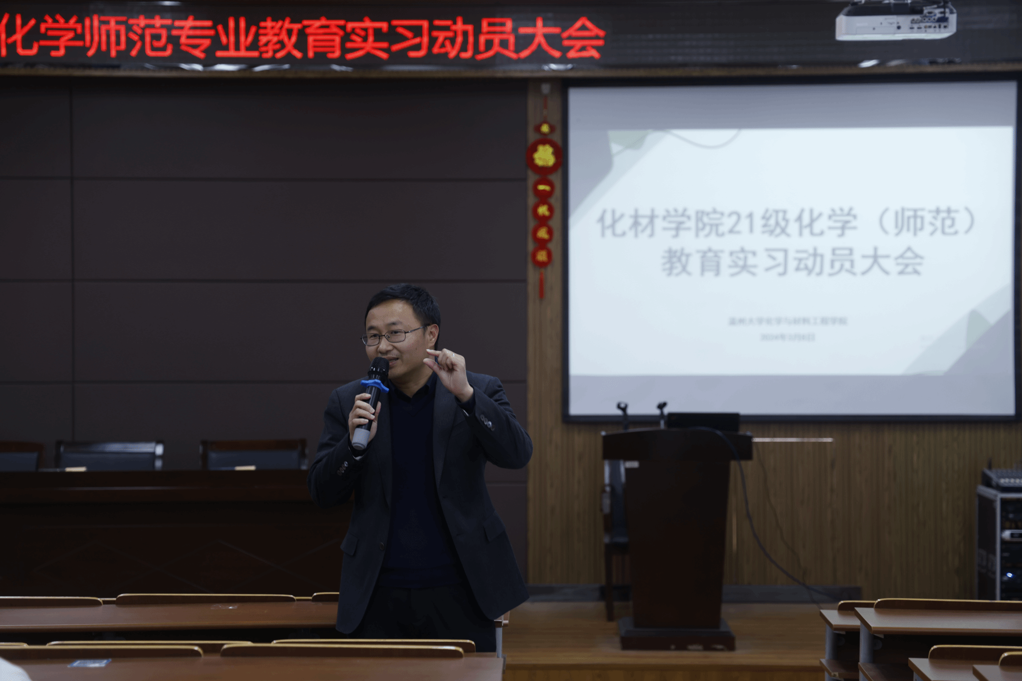 21 级师范教育实习动员大会在 11C401 圆满举行。化材学院副院长陈锡安、化学系主任方国勇、实习指导师叶剑强等学院领导与教师出席。同时,特别邀请到温州市化学与材料学会化学教育分会理事、瑞安中学徐克老师,以及双屿中学林光第老师莅临,为大会带来专题讲座。21 级全体化学师范专业学生积极参与,大会由李国朋老师主持。