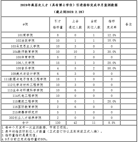 实施“英才汇聚”工程、大力引进高层次人才是学校推进“升博”行动计划和省重点高校建设的重要支撑。为进一步做好相关工作,根据学校统一部署,人事处将统计公布“高层次人才(具有博士学位)引进指标完成半月监测数据,以供各学院、部门及时掌握有关信息,及时推进人才引进工作,高质量完成人才引进工作任务。现将2019年1月1日至2019年2月28日的数据公布如下: