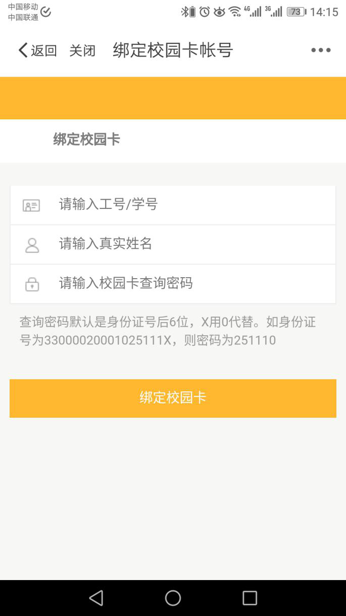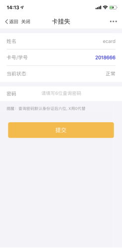 在“二代校园卡”微应用里选择挂失卡功能,进入下图页面,输入校园卡的查询密码(默认是身份证后6位,X用0代替)。