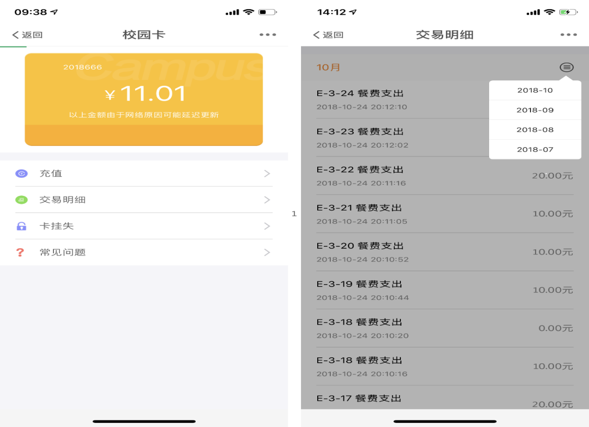 在“二代校园卡”微应用里选择交易明细,可以查看消费记录以及查看每月的消费记录。