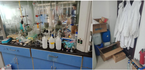 通风橱试剂比较杂乱,不要放在桌子边缘,门口和门后不允许堆放物品,务必保证消防通道畅通,实验室物品排放整齐,减少占用通道,私人物品应放于办公桌子的抽屉或柜子,不要摆放在外面。