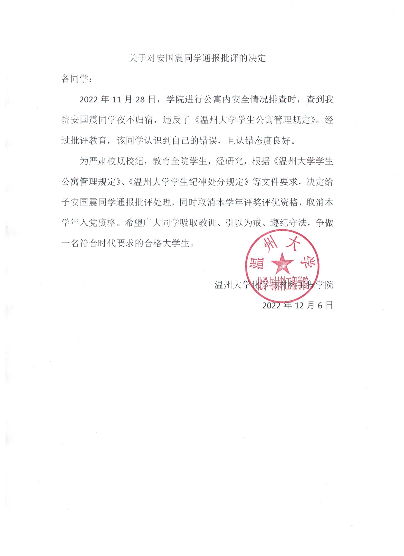 关于对安国震同学通报批评的决定