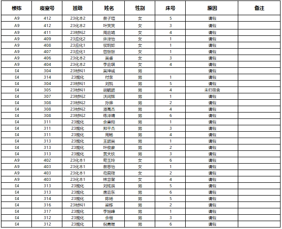 (1)请假的学生需由舍友出示请假材料;