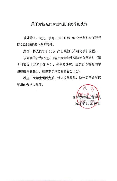 关于对杨光同学通报批评的决定