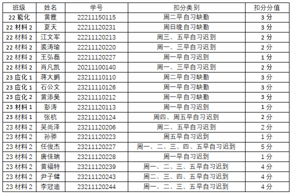 ”微信公众号平台公布本周考勤结果,如对公布的考勤结果有异议请当周周五下午4:30前到学生科办公室11B223说明情况,过时无效。22级、23级联系邹培杰老师。3、每周将在化材学院官方网站上公布上周最终考勤结果。4、早晚自习考勤结果纳入月形象班级考核。