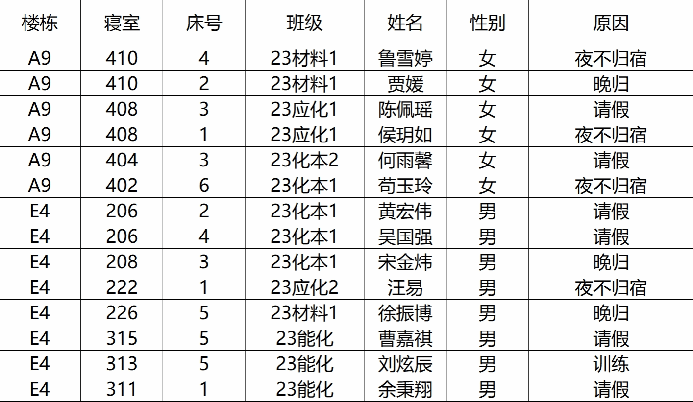 2.若在检查时间段内不在宿舍:
