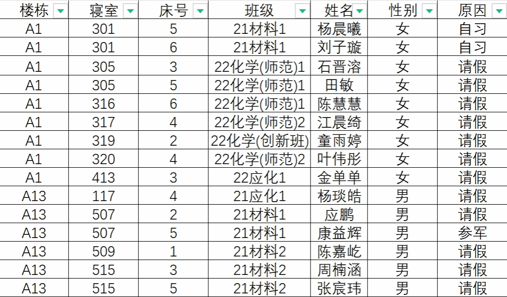 (1)请假的学生需由舍友出示请假材料;