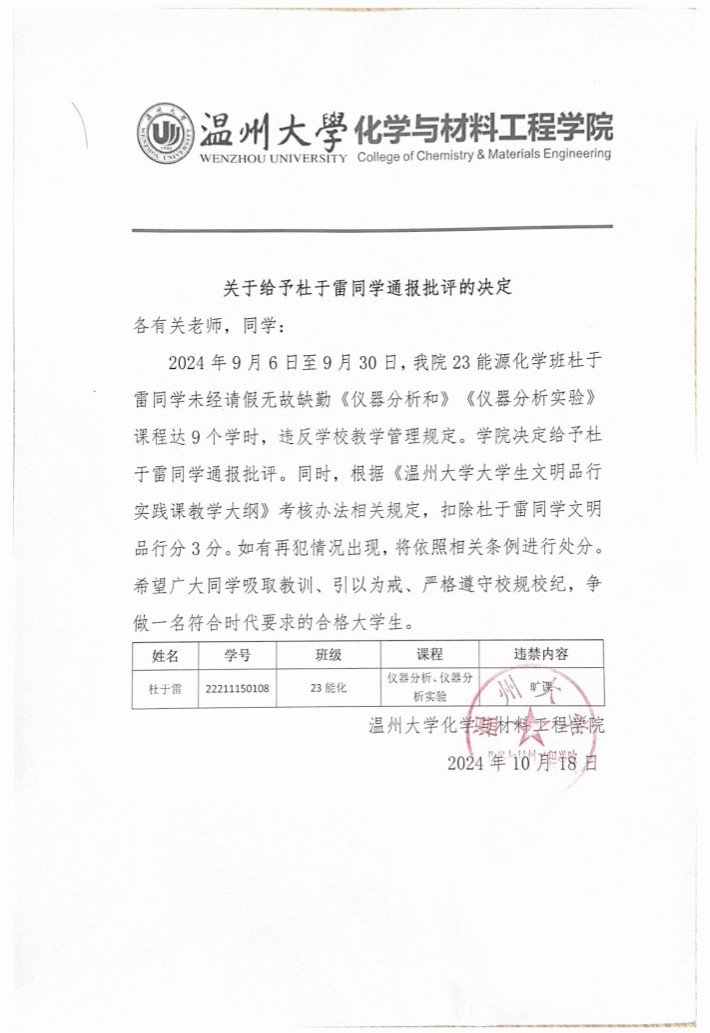 关于给予杜于雷同学通报批评的决定