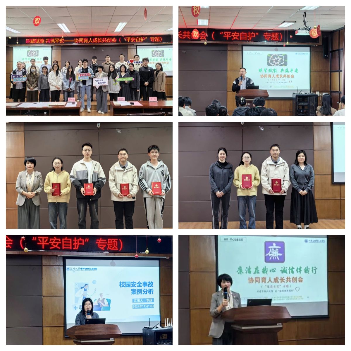 辅导员李政、胡竞尹老师为获得2023-2024学年校级优秀班级安全委员和心理委员代表颁发荣誉证书,感谢他们过去一年在班级中发挥心理筑安、综合护安中的管理引领作用,勉励他们继续当好团学干部的“排头兵”。