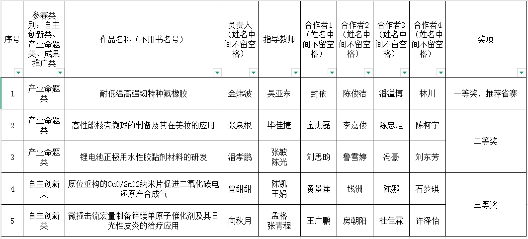 根据浙江省举办第一届浙江省大学生新材料创新与实践大赛的工作要求,经学生作品提交、评审评议等程序,现就化材学院第一届浙江省大学生新材料创新与实践大赛学院预选赛结果名单予以公示: