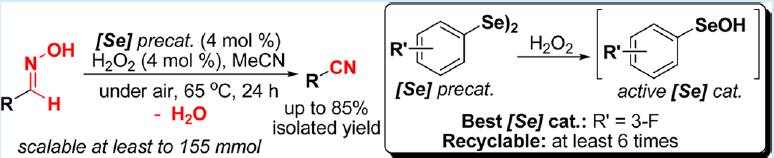 (35) Lei Yu,* Hongyan Li, Xu Zhang, Jianqing   Ye, Jianping Liu, Qing Xu,* Mark Lautens.   Organoselenium-Catalyzed Mild Dehydration of Aldoximes:   An Unexpected Practical Method for Organonitrile Synthesis. Org. Lett.   2014, 15   (3), 1346-1349 (SCI-II,   IF: 6.364). DOI:10.1021/ol500075h