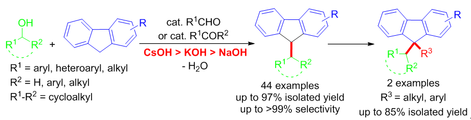 (11) Jianhui Chen,† Yang Li,† Shuangyan Li,   Jianping Liu,* Fei Zheng, Zhengping Zhang, and Qing Xu*,   Aldehyde/Ketone-Catalyzed Highly Selective Synthesis of 9-Monoalkylated Fluorenes   by Dehydrative C-Alkylation with Primary and Secondary Alcohols, Green   Chem. 2017, 19 (1), 623-628. (SCI新一区,IF   8.506) DOI:   10.1039/c6gc02518h