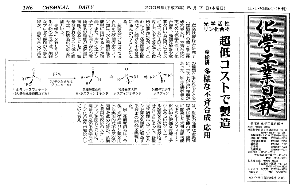 (2)           Li-Biao Han,   Qing Xu. Method for Producing Optically Active Phosphorus   Compound. Japanese   Patent JP2008-69103A.
