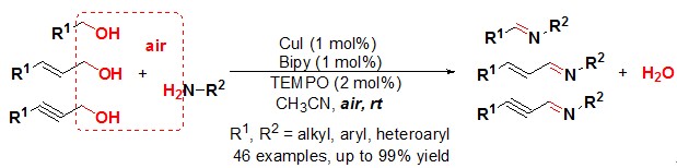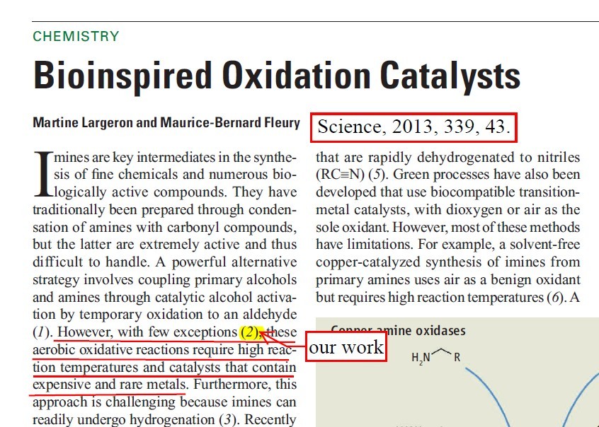 (46) Haiwen Tian, Xiaochun Yu, Qiang Li,   Jianxin Wang, Qing Xu.* General,   Green, and Scalable Synthesis of Imines from Alcohols and Amines by a Mild   and Efficient Copper-Catalyzed Aerobic Oxidative Reaction in Open Air at Room   Temperature. Adv. Synth. Catal. 2012,   354 (14-15), 2671-2677 (SCI-II, IF: 5.663).   DOI:10.1002/adsc.201200574