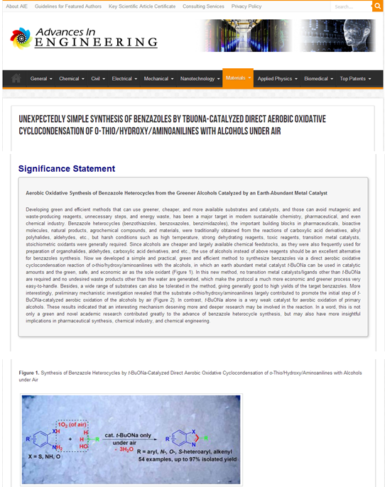 (3)         201510月, 论文“Unexpectedly   Simple Synthesis of Benzazoles by t-BuONa-Catalyzed Direct Aerobic   Oxidative Cyclocondensation of o-Thio/Hydroxy/Aminoanilines   with Alcohols under Air(Chem.   Eur. J. 2015,   21, 9988) Advances   in Engineering 评为“a   Key Scientific Article contributing to excellence in engineering, scientific   and industrial research”;