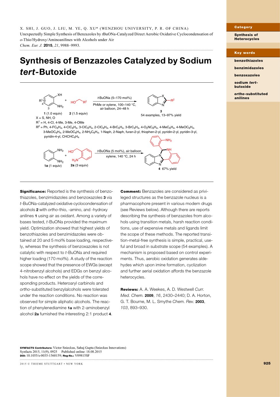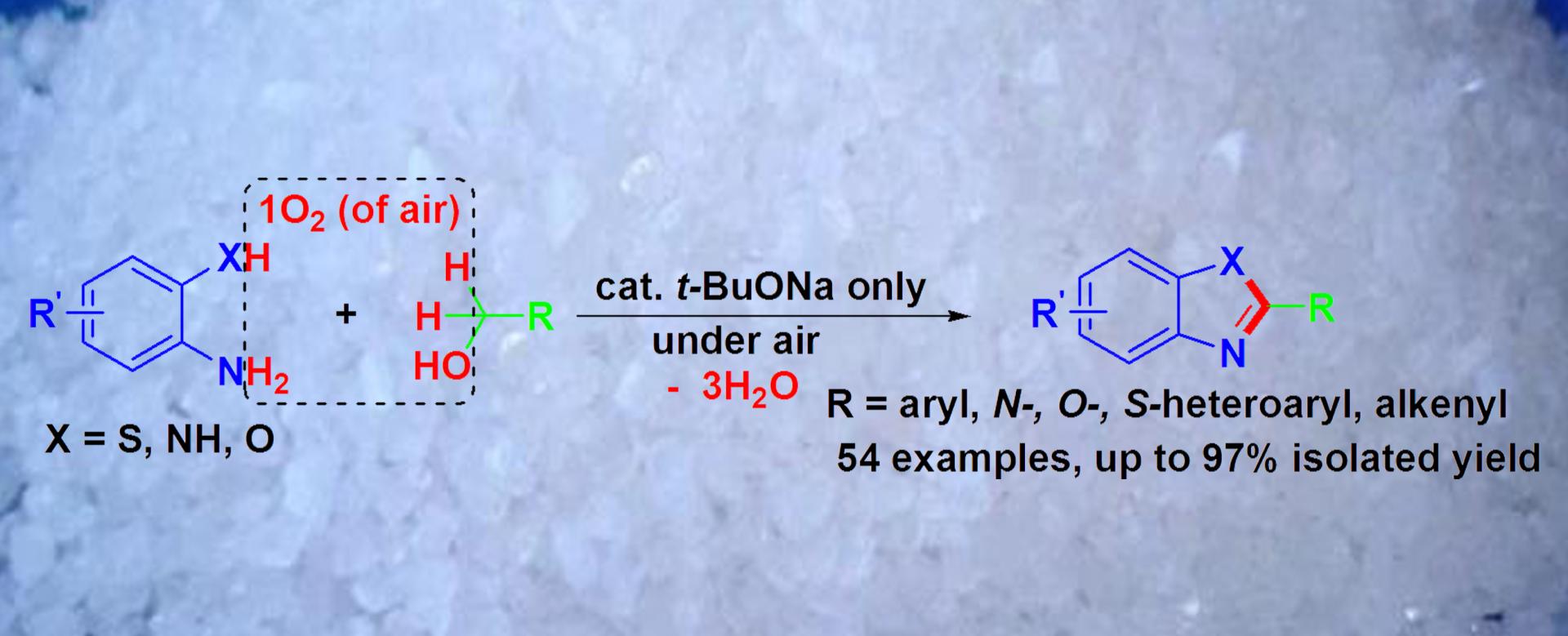 (26) Xinkang Shi, Junmei Guo, Jianping Liu,   Mingde Ye, Qing Xu.* Unexpectedly   Simple Synthesis of Benzazoles by t-BuONa-Catalyzed Direct Aerobic   Oxidative Cyclocondensation of o-Thio/Hydroxy/Aminoanilines   with Alcohols under Air. Chem.   Eur. J. 2015,   21 (28), 9988-9993 (SCI-II, IF: 5.731). DOI:   10.1002/chem.201501184