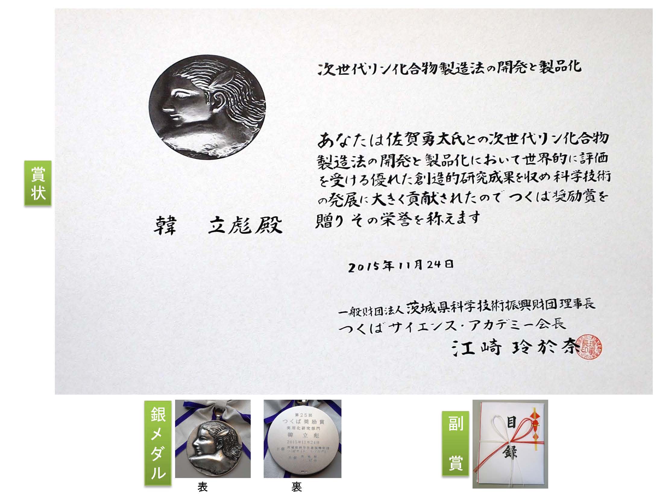 本人参与Han教授的该系列工作20154月和9月分别获得日本科学技术奖(日本文部科学大臣表彰)和筑波奖励奖(つくば奨励賞)