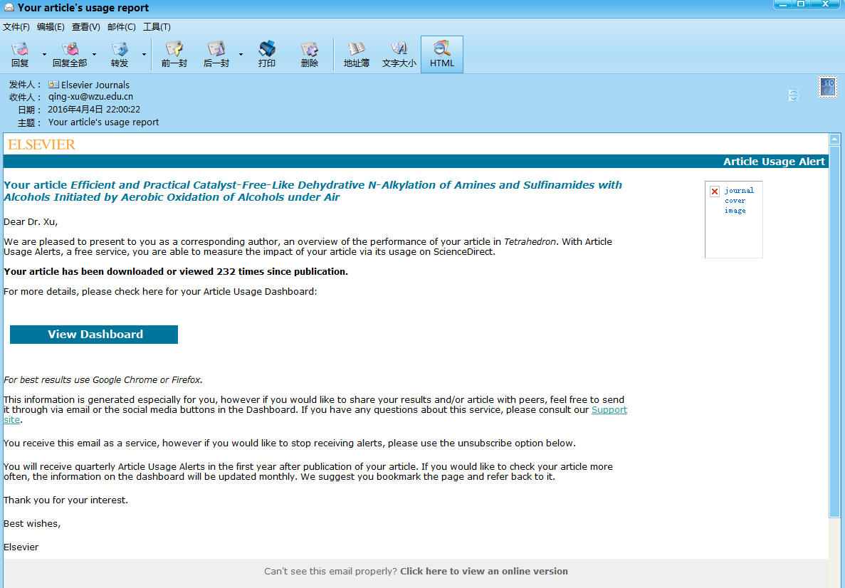 (5)       20148月,论文Copper-Catalyzed   N-Alkylation of Amides and Amines with Alcohols Employing the Aerobic   Relay Race Methodology”(Org.   Biomol. Chem. 2012,   10 (15), 2966-2972) 被评为2011-2012影响因子周期Org.   Biomol. Chem.杂志top 10% of the   most highly cited articles