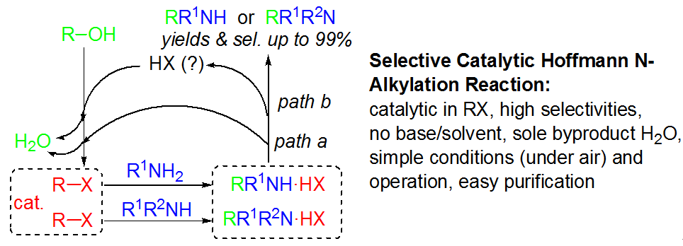(18) Qing Xu,* Huamei Xie, Er-Lei Zhang, Xiantao Ma, Jianhui   Chen, Xiao-Chun Yu, and Huan Li. Selective Catalytic Hoffmann N-Alkylation of   Poor Nucleophilic Amines and Amides with Catalytic Amounts of Alkyl Halides. Green.   Chem. 2016, 18 (14), 3940-3944. (SCI-II, IF:   8.506). DOI:   10.1039/C6GC00938G
