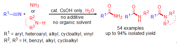 (14) Yang Li, Haonan Chen, Jianping Liu,*   Xujun Wan, and Qing Xu*, Clean Synthesis of Primary to Tertiary   Carboxamides by CsOH-Catalyzed Aminolysis of Nitriles in Water, Green   Chem. 2016, 18 (18),   4865–4870. (SCI-II, IF 8.506) DOI:   10.1039/C6GC01565D