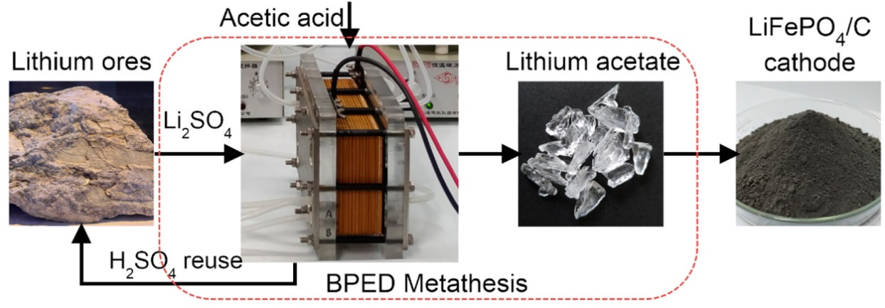 制备LiFePO4的常用锂源为Li2CO3,但是Li2CO3并不是锂产业链的初级锂盐。生产Li2CO3需要通过锂矿石酸化焙烧获得Li2SO4溶液,之后再加入纯碱制备得Li2CO3.该路线生产Li2CO3,因额外添加了H2SO4、Na2CO3等化学试剂产生了Na2SO4废弃物,造成资源的浪费。CH3COOLi也是一种非常好的LiFePO4前驱体材料,CH3COOLi没有广泛应用于LiFePO4的制备,是因为CH3COOLi复杂的合成路线和锂资源的损失限制了它的应用。因此,能开发出一种简单、绿色、经济高效的新方法制备CH3COOLi,将有很好的应用前景。