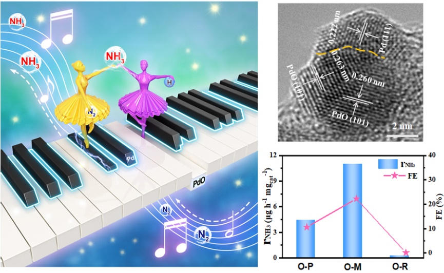聂华贵教授和周学梅博士等通过理论计算发现,在纯Pd中引入氧后,能增加氮吸附能,使其锚定在异质结界面的Pd上;H原子吸附在异质结界面的氧上,表现出更高的H吸附能,能够抑制副反应(氢析出)。据此,本研究结合温和的电化学沉积法,制备了一种氧含量可调的Pd/PdO异质结并应用于NRR反应,其展现出优异的催化活性和选择性,即在0.03 V电压下(相对于可逆氢电极),氨气产率和法拉第效率(FE)分别为11.0 μg h−1 mgcat−1和22.2%。为了排除实验中N污染的干扰,本研究运用15N同位素示踪法证明了氨气中N的来源。