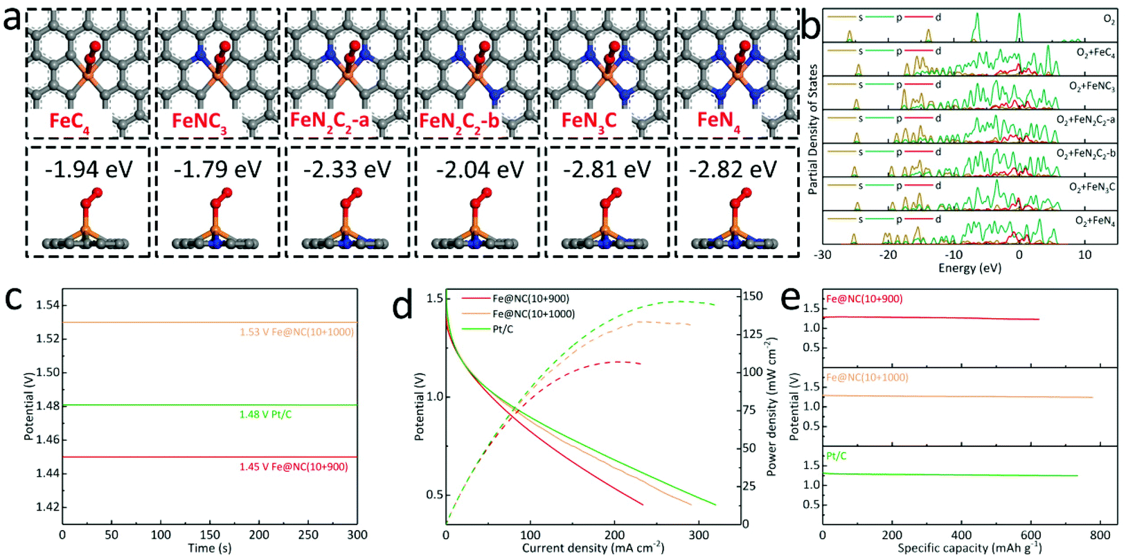 3、ZIF衍生的Fe基活性物质(FeNx位点以及Fe纳米颗粒)可以作为锌-空气电池的高效ORR电催化剂。