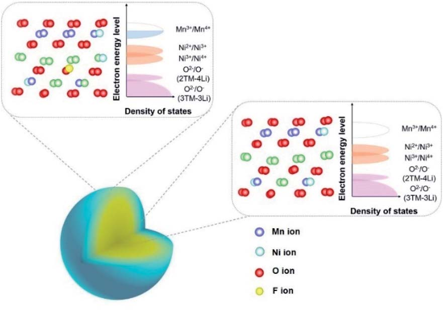 锂离子电池正极材料能量密度不足被公认为是阻碍混合动力汽车和电动汽车发展的主要瓶颈。经过数十年的研究,正极材料的能量密度从550 W h kg-1(LiCoO2,工作电压窗3.0-4.2 V)提高到了700 W h kg-1(LiNi0.8Co0.15Al0.05O2(NCA),电压窗口3.0-4.5V),尽管纯电动汽车现在可以由数千节NCA正极的18650型电池供能,然而NCA中Ni含量高,热稳定性差,存在严重的安全隐患。因此,具有较高能量密度(~900 W h kg-1)和良好热力学稳定性的富锂层状氧化物(LLO)成为了最有前途的正极材料之一。然而,由于过度脱锂引发的不可逆转变,如:相变、氧释放和Mn3+的Jahn–Teller效应等限制了其实际的应用。本文发现,在Li1.2Ni0.2Mn0.6O2中,Mn3+/Mn4+建立了梯度阳离子氧化还原电对,降低了重复脱/嵌锂过程中的不可逆过程。根据STEM、XPS和XAS测试显示,F-部分替换O2-,促进了附近锂/过渡金属的混合,降低了Mn表面的价态。这种构型使表面氧化还原中心向阳离子氧化还原电对(Mn3+ /Mn 4+)移动,减少了不可逆的氧释放以及随之而来的结构和氧化态的变化。利用x射线吸收能近边结构(XANES)、扩展X射线吸收精细结构(EXAFS)和DFT计算研究了重复循环过程中受抑制的不可逆过程,确认了改性Li1.2Ni0.2Mn0.6O2保存完好的氧化态和原子构型。本文通过调节阳离子表面的氧化还原电对,为控制LLO中的不可逆过程提供了一条新途径,同时又不改变体相晶格O2-离子氧化氧还原行为。