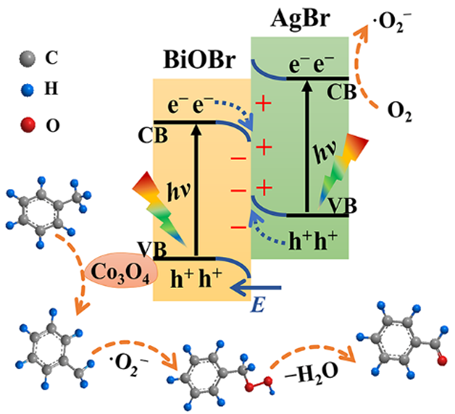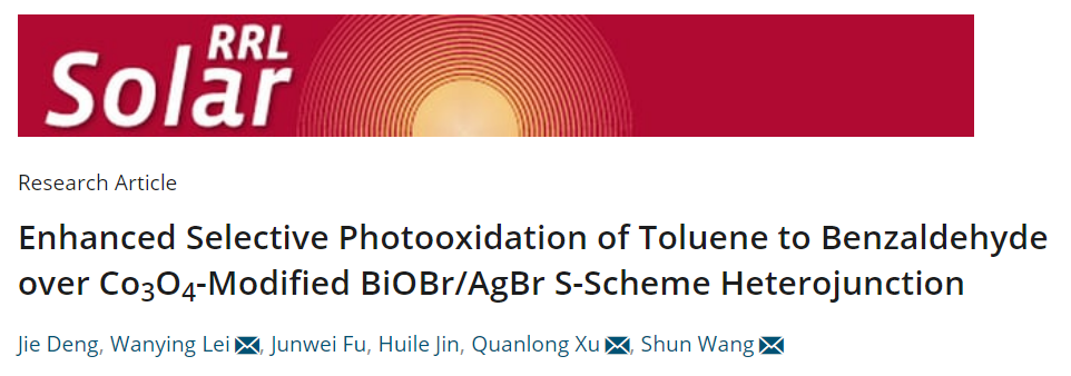 徐全龙副教授在国际期刊《Solar RRL》发表了题为”Enhanced Selective Photooxidation of Toluene to Benzaldehyde over Co3O4-Modified BiOBr/AgBr S-Scheme Heterojunction”的论文。在这项工作中,Co3O4修饰的BiOBr/AgBr S型异质结可以有效地将苄基位的sp3 C-H键氧化成相应的醛,苯甲醛的选择性达到94%,远高于纯BiOBr (21.7%)和AgBr (58.9%)。通过 X 射线光电子能谱和活性物质猝灭实验,证实了三元复合材料的S型电荷迁移机制。保留在AgBr导带中的具有强还原能力的光生电子可以与O2反应生成•O2−活性物质,其可进一步将Co3O4表面形成的苄基自由基氧化为过氧自由基,然后热力学分解为苯甲醛。该工作对光催化剂的结构调控及其在烃类sp3 C-H键选择性氧化中的应用具有重要的指导意义。