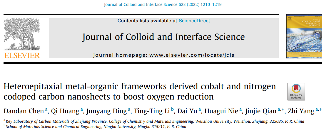 Dandan Chen, et al. Heteroepitaxial Metal-Organic Frameworks Derived Cobalt and Nitrogen Codoped Carbon Nanosheets to Boost Oxygen Reduction. J. Colloid Interface Sci., 2022, 623, 1210-1219.