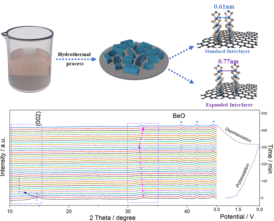 化材学院碳中和技术创新研究院肖遥团队在国际权威期刊《ACS Applied Materials & Interfaces》(//pubs.acs.org/doi/abs/10.1021/acsami.2c05485)上发表题为“Expanding the ReS2 Interlayer Promises High-Performance Potassium-ion Storage”的研究论文。本文利用二维层状材料的特点,采用二维材料层间距扩大的策略,通过简单的水热法,在还原氧化石墨烯(rGO)表面上合成了扩层的ReS2纳米片。所制备的ReS2纳米片的层间距为~ 0.77 nm,远大于扩层前的0.61 nm。采用原位XRD技术研究了ReS2在钾离子电池中的离子存储机制,揭示了钾离子在扩层ReS2中嵌入和转换两种混合的模式。扩层的纳米复合材料在0.05、0.2 和 1.0 A/g电流密度下表现出 432.5、316.5和241 mAh/g的高比容量,并在1A/g的电流密度下,表现出优异的可逆性。总体而言,这种材料局域化学策略也为其他材料的开发应用提供了新的借鉴。