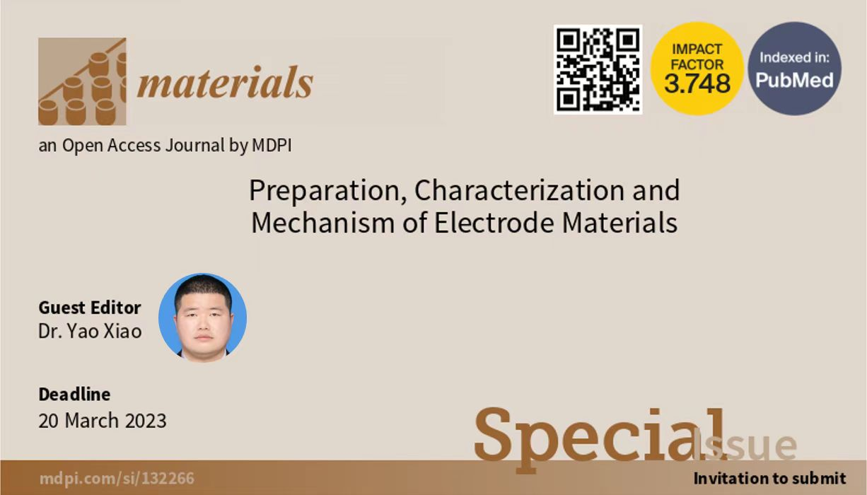 化材学院碳中和技术创新研究院肖遥博士受邀担任国际期刊《Materials》(《材料》)的专刊“Preparation, Characterization and Mechanism of Electrode Materials”(电极材料的制备、表征及机理)的Guest Editor(客座主编)。该专刊将发表“电极材料的制备、表征及机理”相关领域的研究论文和综述文章,旨在邀请各个领域的专家学者发表高质量、前瞻性的重要著作,为促进各领域科学家之间的合作提供一个独特的高水平论坛。