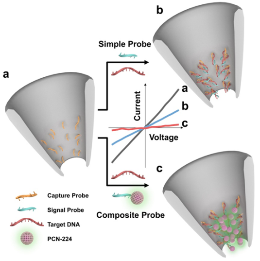 该工作的创新点在于:1)基于DNA@MOF复合探针的玻璃纳米管用于超灵敏检测Target DNA;2)传感体系同时具有离子电流响应和荧光信号。与简单探针相比,复合探针在1 nM Target DNA中电流信号增加70%;3)在纳米材料表面引入占位策略优化探针的配对效率,有助于探针载体在纳米孔道中的研究应用。