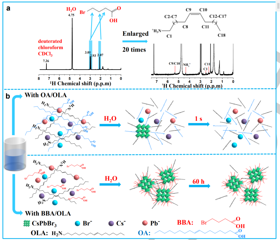 潘跃晓、中科院长春应化所林君等人报道发展了一种简单有效的原位晶化方法能够显著改善钙钛矿量子点的稳定性,通过在含有水的极性溶剂通过4-溴丁酸(BBA)和油胺(OLA)的协同作用实现提高钙钛矿量子点在溶液中的稳定性。