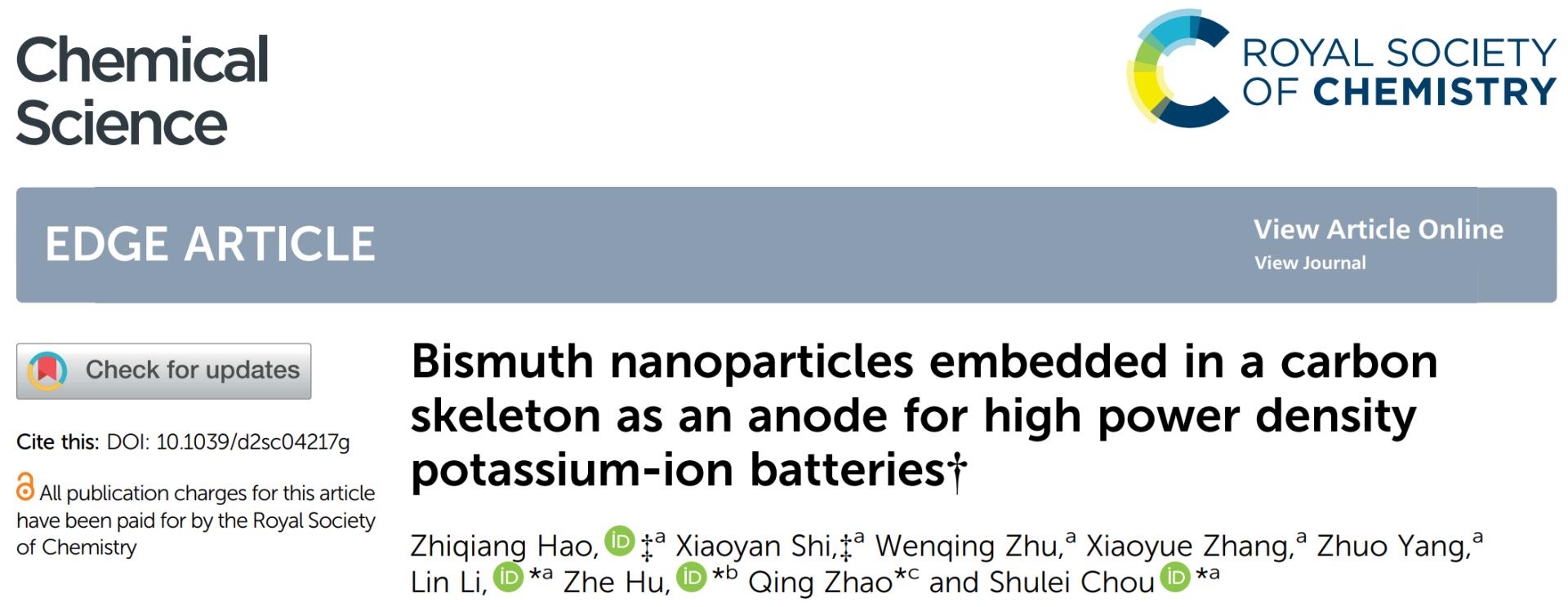 近日,我院碳中和技术创新研究院李林团队、深圳大学轷喆特聘教授和南开大学赵庆研究员合作在国际权威期刊Chemical Science上发表题为《Bismuth Nanoparticle Embedded in Carbon Skeleton as Anode for High Power Density Potassium-Ion Batteries》的学术论文。该工作以柠檬酸铋作为前驱体,通过简易的一步热解法成功将纳米级Bi颗粒均匀嵌入至碳骨架中,形成Bi@C复合材料。在10.0 A g−1的条件下,循环200次,Bi@C负极的可逆容量仍高达255.6 mAh g−1。结合实验表征和第一性原理计算,进一步探究了Bi@C复合材料在醚基电解液中具有快速电化学反应动力学的原因。另外,通过原位X射线衍射揭示了Bi@C复合材料在第一次和随后循环中的储钾机理的差异。最后,通过匹配镍基普鲁士蓝类似物(KNiHCF)正极材料构建了钾离子全电池,其功率密度超过10 kW kg−1,证明了Bi@C负极材料在功率型钾离子电池中的应用潜力。综上所述,该工作通过纳米结构工程、碳包覆和电解液优化等策略,成果实现了Bi负极材料对K+的快速储存,并通过与KNiHCF正极材料组合,成功构建了具有超高功率密度的钾离子全电池。日本a片相关的文章发表在Chemical Science上,日本a片