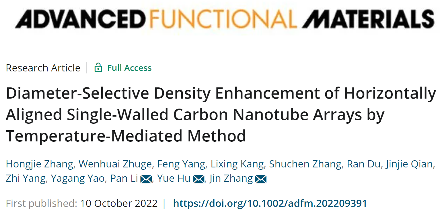 近日我院胡悦特聘教授团队联合南京邮电大学李盼副教授、北京大学张锦教授在控制制备高密度单壁碳纳米管(SWNT)方面取得新进展,开发了一种简单且新颖的温度扰动策略以制备具有管径选择性的高密度SWNT阵列,为SWNT在纳电子器件方面的提供了理想平台。相关成果以标题“Diameter-Selective Density Enhancement of Horizontally Aligned Single-Walled Carbon Nanotube Arrays by Temperature-Mediated Method”(DOI:10.1002/adfm.202209391)发表在Advanced Functional Materials。该工作通过调节温度对金属催化剂容碳量进行调控,再活化具有特定尺寸的因被碳包覆而失活的催化剂,使其继续催化生长特定管径的SWNT。最终使得在石英基底上获得的SWNT阵列的密度增加了三倍以上,且管径分布控制在2纳米左右。并通过环境透射电子显微镜对催化剂再活化过程进行原位研究,为催化剂效率的提高提供了关键性的见解。使用获得的SWNT阵列制作场效应晶体管器件,该器件表现出非常优秀的载流子迁移能力,表明所获得的SWNT阵列在纳电子器件中的应用潜力。日本a片相关的文章发表在Advanced Functional Materials上,日本a片
