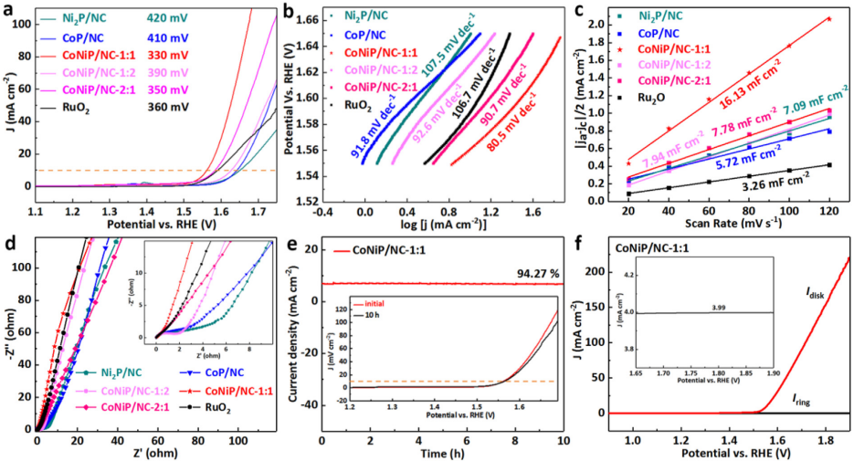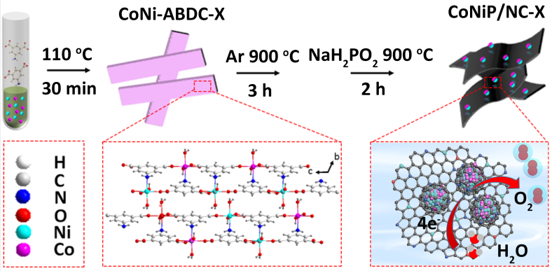 近日,我院钱金杰课题组以一系列Co/Ni基同构MOF(CoNi-ABDC)为前驱体,经过碳化及磷化处理后合成了双金属磷化物纳米颗粒锚定的氮掺杂碳纳米条复合材料CoNiP/NC-X,可将其作为高性能OER催化剂。所获得的CoNiP/NC-1纳米带具有良好的纳米结构、高比表面积、适量的杂原子掺杂、丰富的催化活性位点和高度石墨化的碳网络。因此,该材料在碱性溶液中表现出良好的准四电子OER性能,当电流密度为10 mA cm-2时,过电位为330 mV,Tafel斜率为80.5 mV dec-1,并在10 h稳定性测试后电流保持率为94.27%。